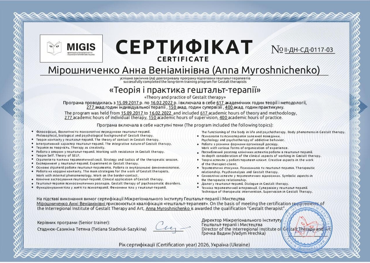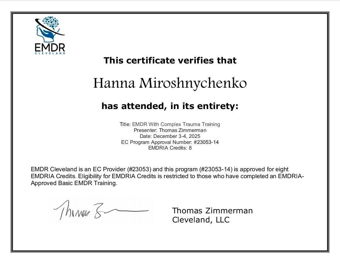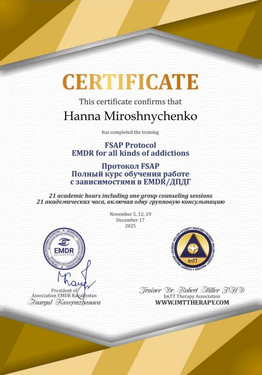 У меня есть опыт эмиграции, жизни с ПТСР и — как у каждого из нас — чемодан личных историй. Всё это делает меня не просто слушателем, а тем, кто по-настоящему рядом.